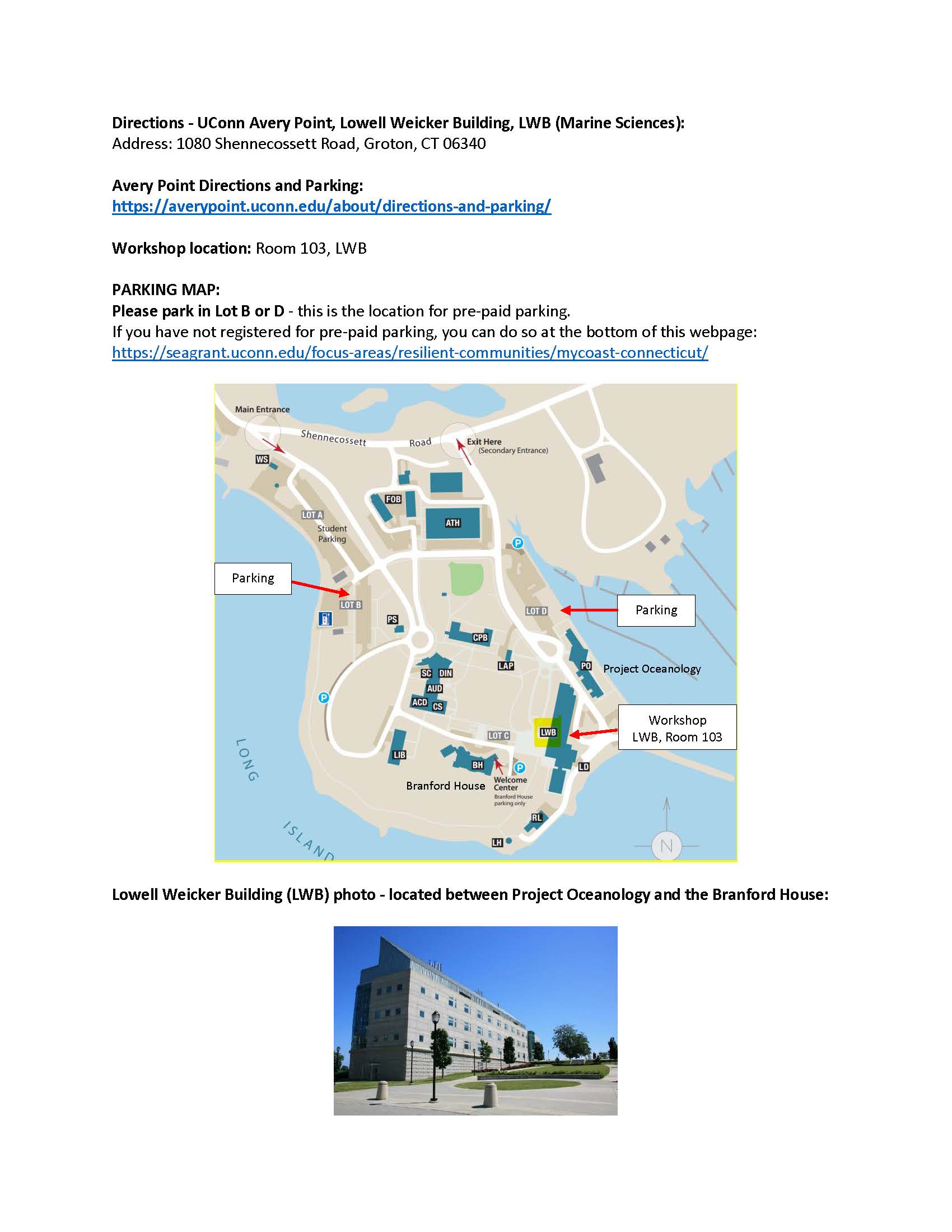 Parking: To receive complimentary parking (otherwise $12/day) in either Lots B or D on the Avery Point Campus, you must enter your license plate number into this parking registration form AND type in the following event passcode (please type this passcode…copy and paste won’t work): 0625AP